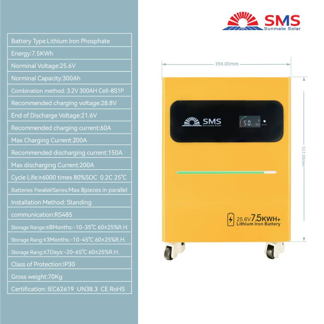 • 24V (25.6V nominal), 200Ah capacity — delivers ~7.5kWh usable energy